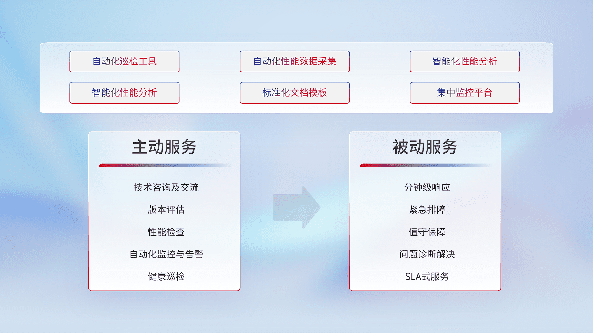 智能化工具和标准化文档,,保障服务质量,,,提供主动服务(包含技术咨询、、、版本评估、、、、性能检查、、、、自动化监控与告警、、、、健康巡检)和被动服务包含(分钟级响应、、、紧急排障、、、值守保障、、、、问题诊断解决、、、SLA服务)。。。。