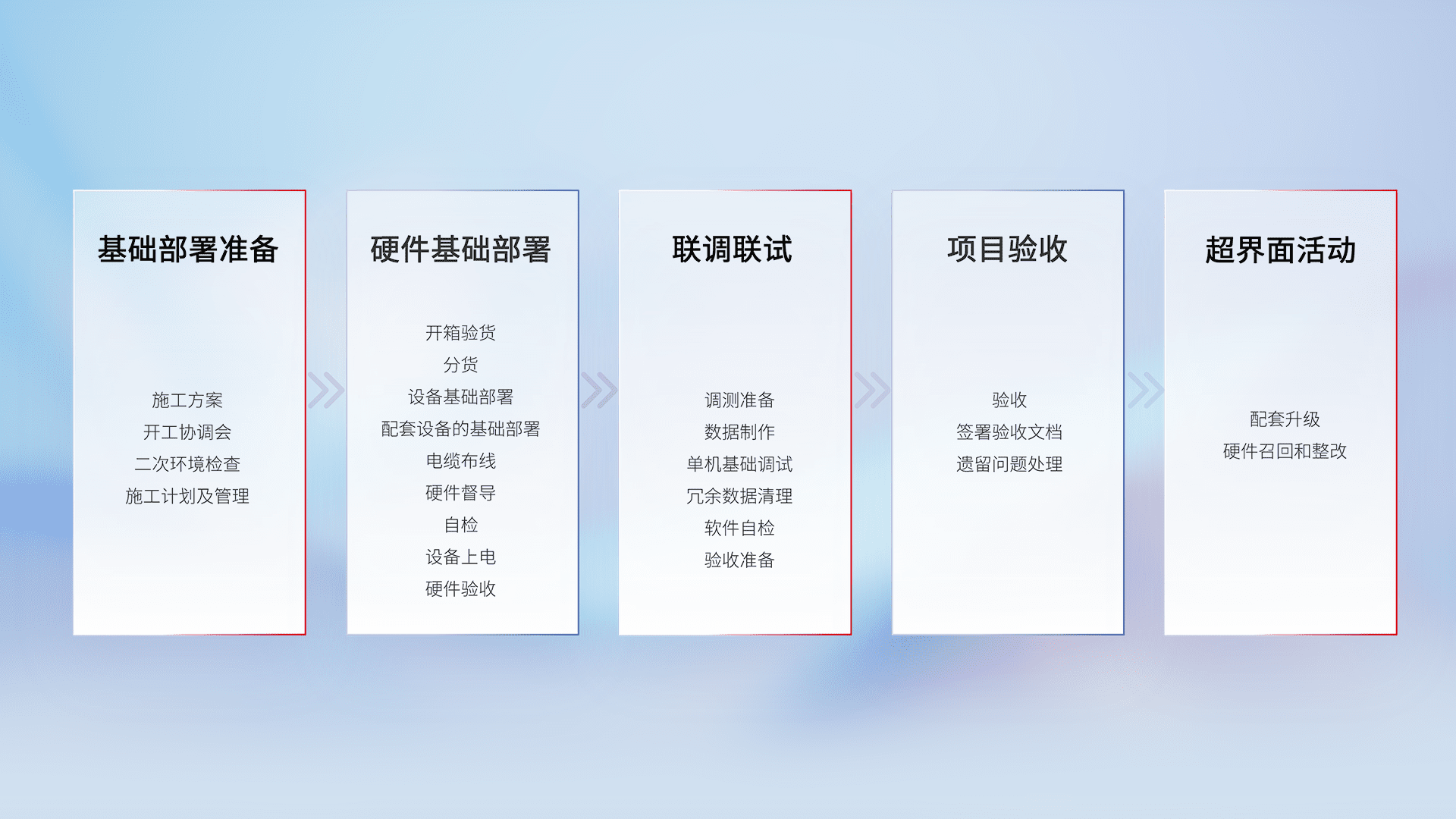 从基础部署准备、、、、硬件基础部署、、、联调联试、、、项目验收、、、越界面活动的全过程可追溯,,,,保证施工质量和进度。。。。